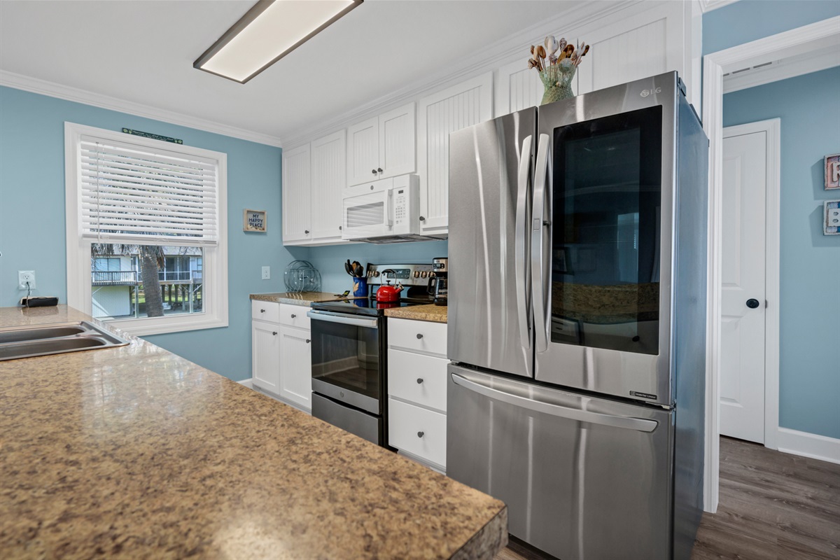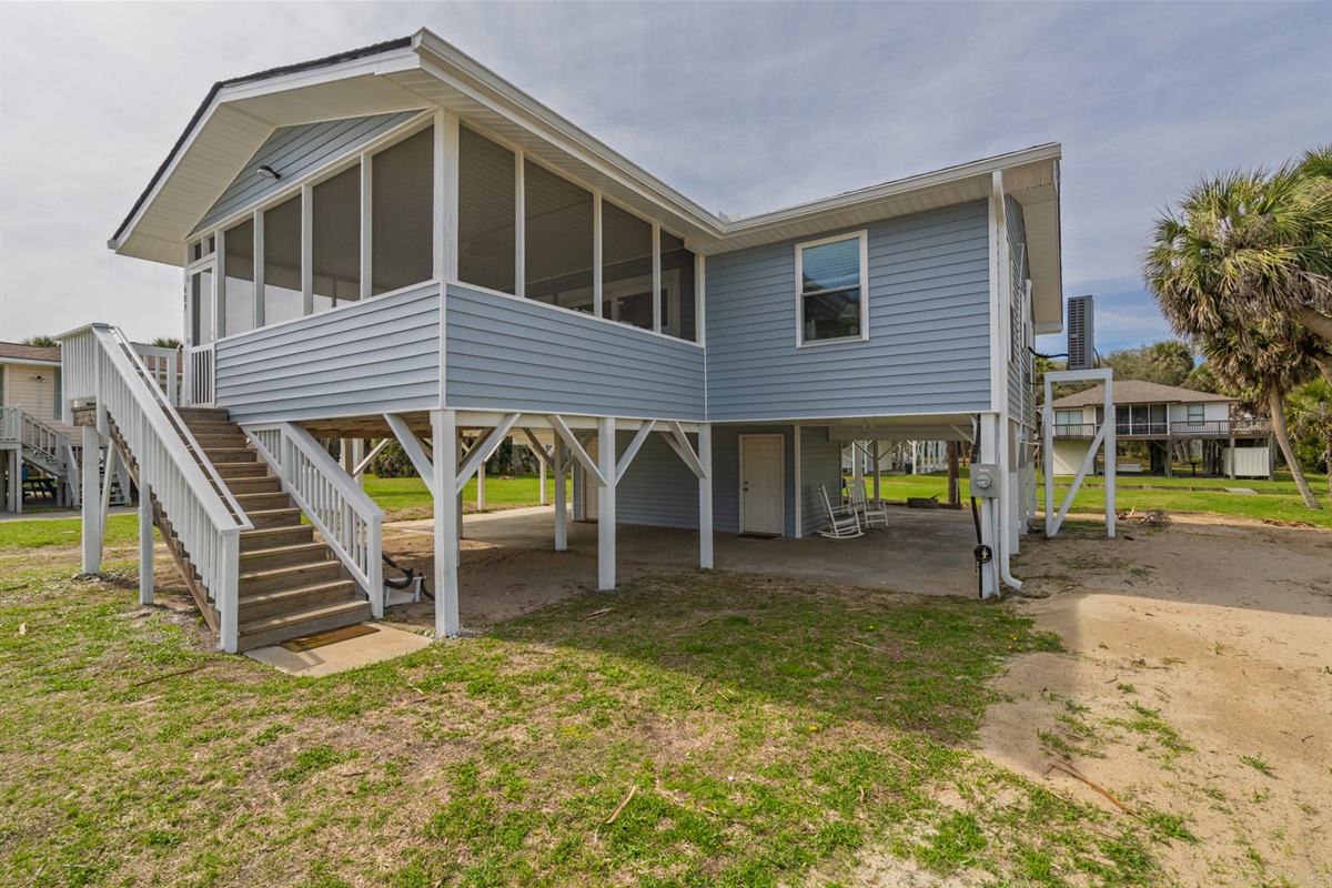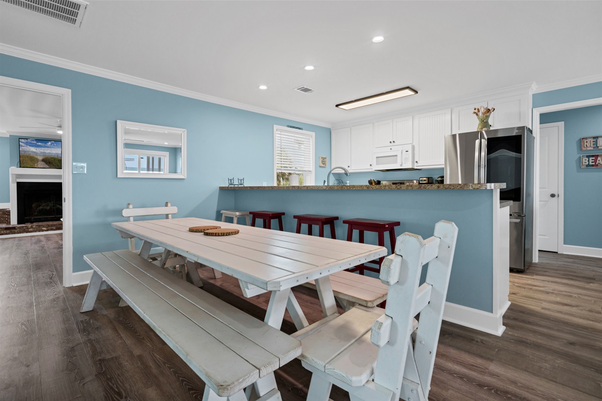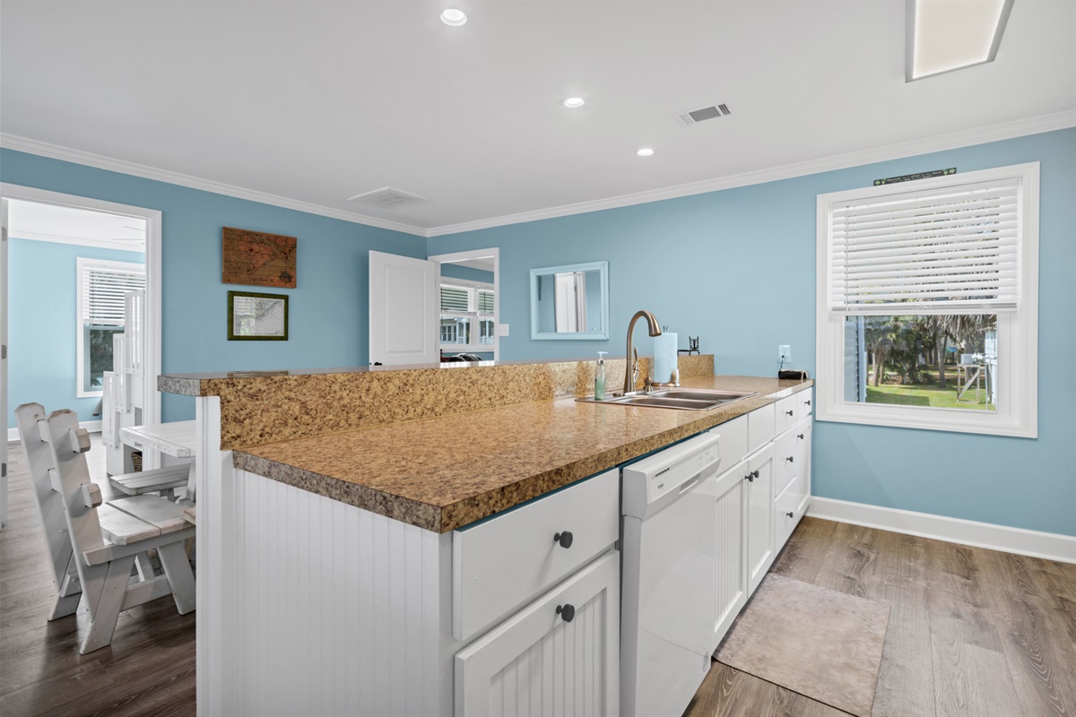 Our kitchen allows you to cook while enjoying the ocean views and socializing; all at the same time. Eat at the main dining table or the bar with bar stools or take your plates out to the screen porch or even down to the table under the house that seats 4.