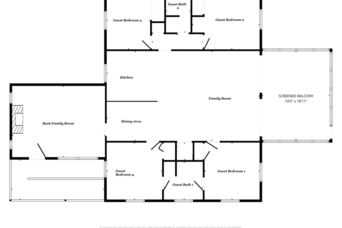 Guest Bedroom 3 is located on the back right side of the house and features a queen bed.