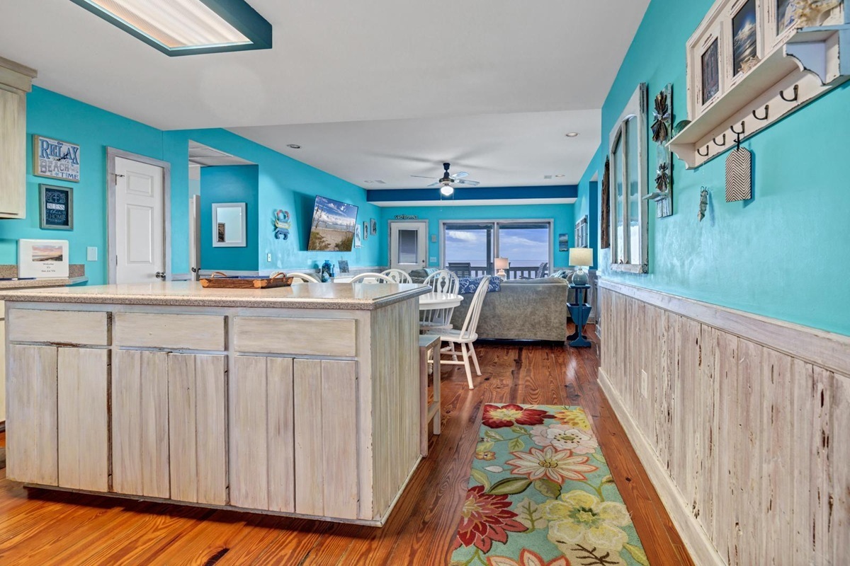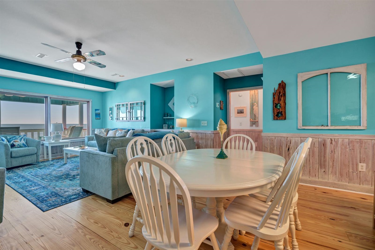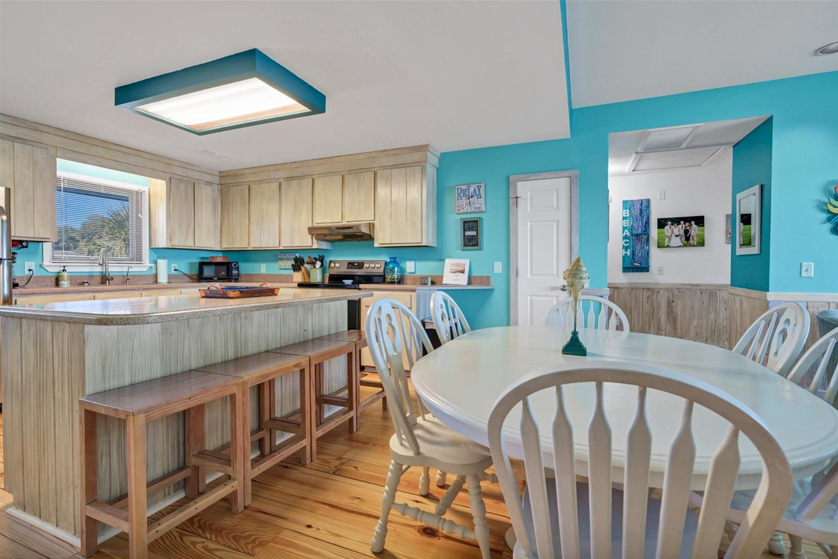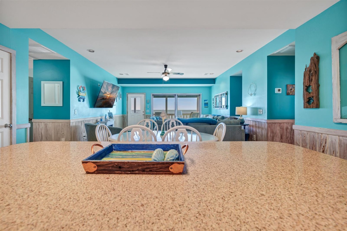 Sea La Vie's open family room/kitchen/dining area makes a perfect central location for chatting over a glass of wine while preparing a delicious meal for friends and family. The dining table and bar settings will ensure everyone has a “seat at the table” for every special celebration.